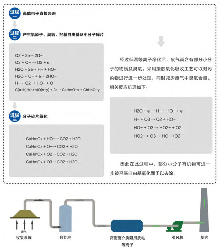 在外加電場的作用下,介質(zhì)放電產(chǎn)生的大量攜能電子轟擊污染物分子,使其電離、解離和激發(fā),然后引發(fā)了一系列物理、化學(xué)反應(yīng),是大分子污染物轉(zhuǎn)變?yōu)楹唵涡》肿影踩镔|(zhì),或使有毒物質(zhì)轉(zhuǎn)變?yōu)闊o毒無害或低害低毒物質(zhì),從而使污染物異味得以降解去除。因其電離后產(chǎn)生的電子平均能量在1eV~10eV,適當(dāng)控制反應(yīng)條件可以實(shí)現(xiàn)一般情況下難以實(shí)現(xiàn)或速度很慢的反應(yīng)變得十分快速。